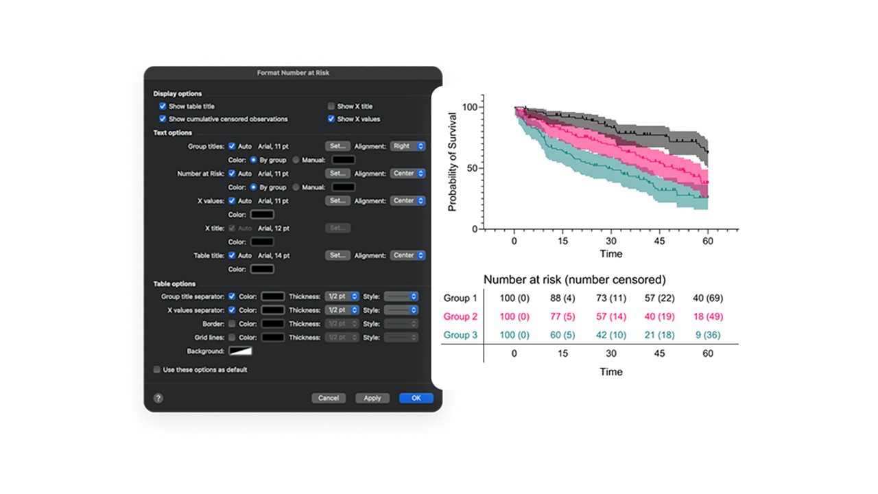 シンプルで統合されたワークフローで、生存データの全体像を把握できます。この組み込み表は、カプランマイヤープロットの各時点におけるリスクのある被験者数(およびオプションで打ち切り)を自動的に表示します。グラフの範囲を変更すると自動的に更新されるため、手作業にかかる時間を節約できます。