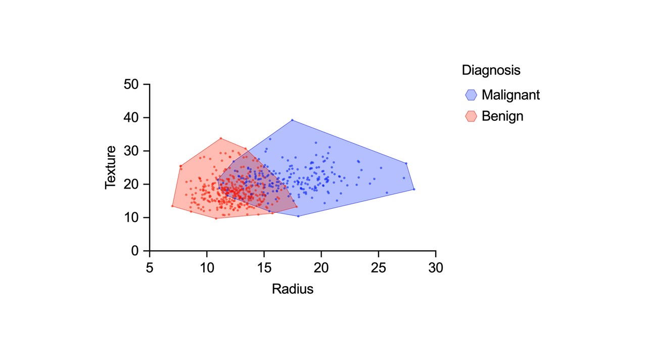 信頼楕円と凸包を用いて、データ内のグループの境界と変動性を明らかにします。グループのコンパクトさ、分散、重なりを瞬時に表現することで、複雑な関係性を紛れもなく明確に示します。
