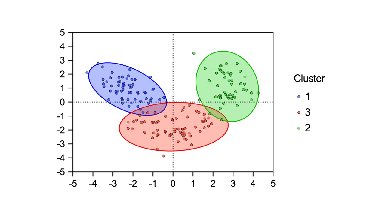 最適化されたK平均法アルゴリズムを用いて、データを重複のない明確なクラスターに分割します。クラスターの数がわからない場合は、Prismが高度なメトリクスを用いて最適なクラスター数を自動的に決定します。Confidence Ellipses/Convex Hulls