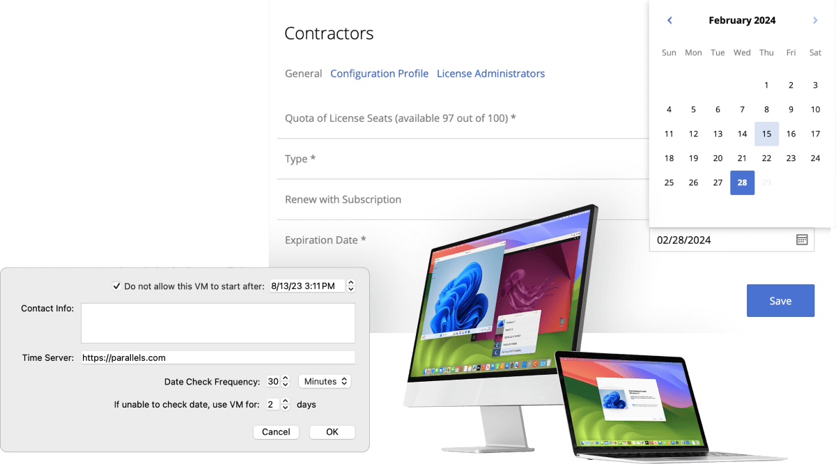 WindowsのアプリケーションをDockに追加し、Jamf、lntune、Kandji、Mosyle、Munki、およびその他のMacの管理ツールを使用してシングルアプリケーションモードを実現できます。自動的に生成されるParallels Desktopのダウンロードリンクが併記されたメールにより、わずか数クリックで新規ユーザーを登録できます。インストールはすべて自動的にアクティベートされます。簡単なセットアップ