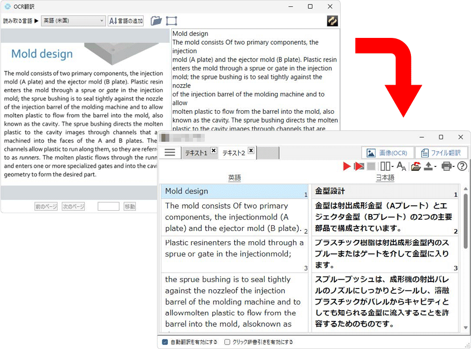 原文が保存されたファイルを読み込み、自動で翻訳された内容を別ファイルとして保存・表示し、翻訳結果をすぐに確認することができます。