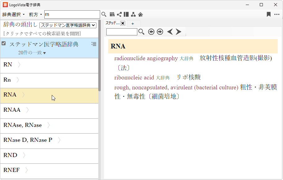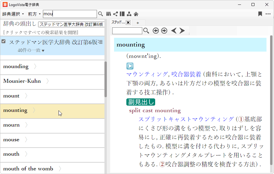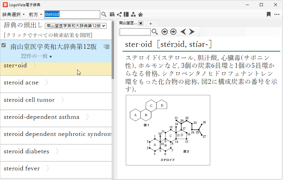 医療文献の翻訳に最適な専門辞書を標準搭載し、「研究社 新英和(第7版)和英(第5版)中辞典-音声付き」に加え、医学英和辞典の「ステッドマン医学大辞典 改訂第6版」と「ステッドマン医学略語辞典」「南山堂 医学英和大辞典 第12版」を収録しています。