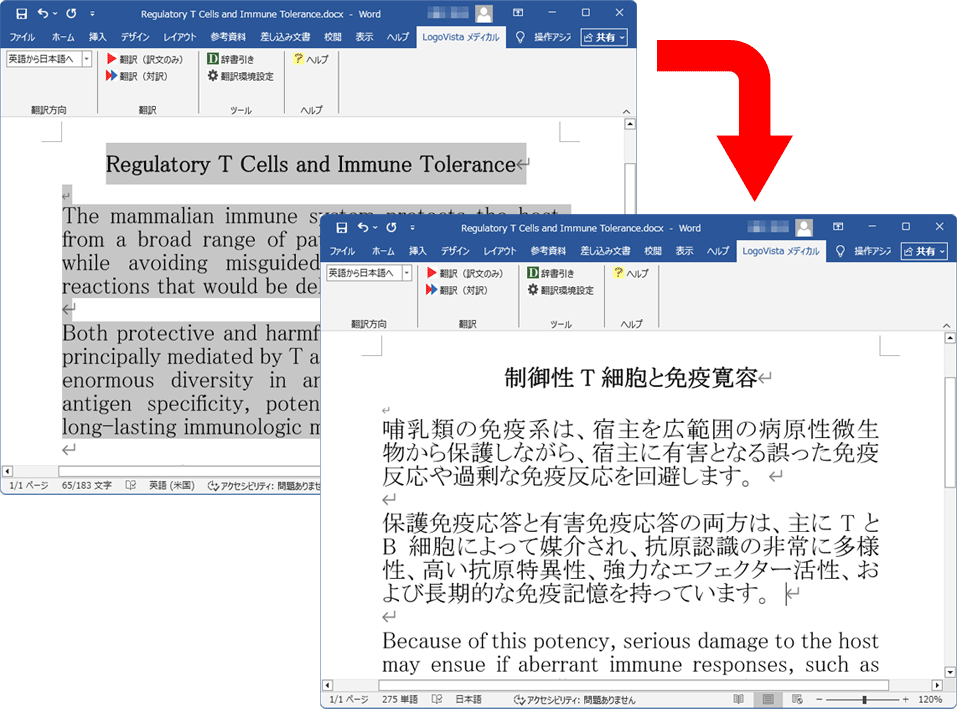Wordでは選択したテキストだけを翻訳したり、Excelではセル内の文字をそのまま翻訳するなど、文 書作成の流れを妨げずにスムーズに利用できます。【対応バージョン】