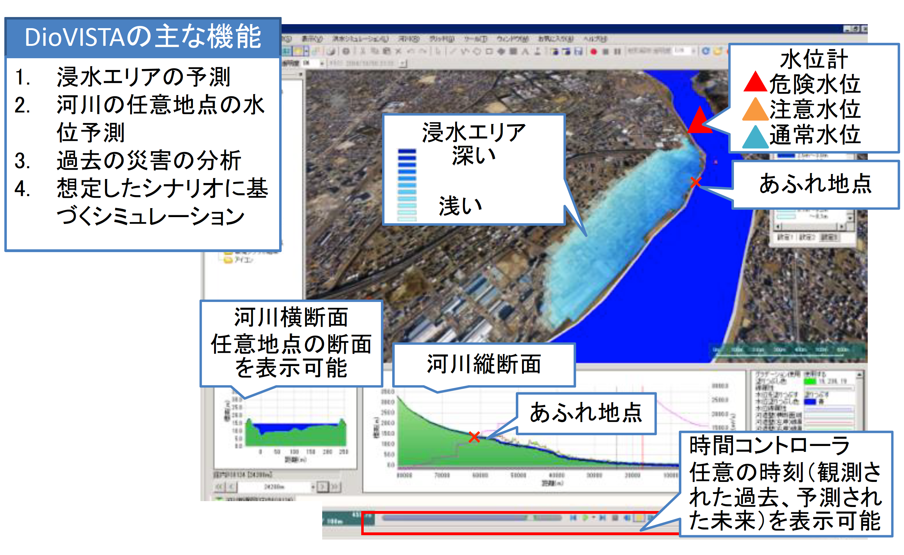 DioVISTA/Floodは、河川水位、浸水地域、浸水深の分布を予測します。DioVISTA/Floodの強みは、予測困難な事態が発生した場合でも、その条件を反映したシミュレーションを実施できることです。堤防が決壊した場合、上流のダムを放流する場合など、予測困難な事態が発生した場合でも、その条件をその場で入力し、再度シミュレーションを実施できます。