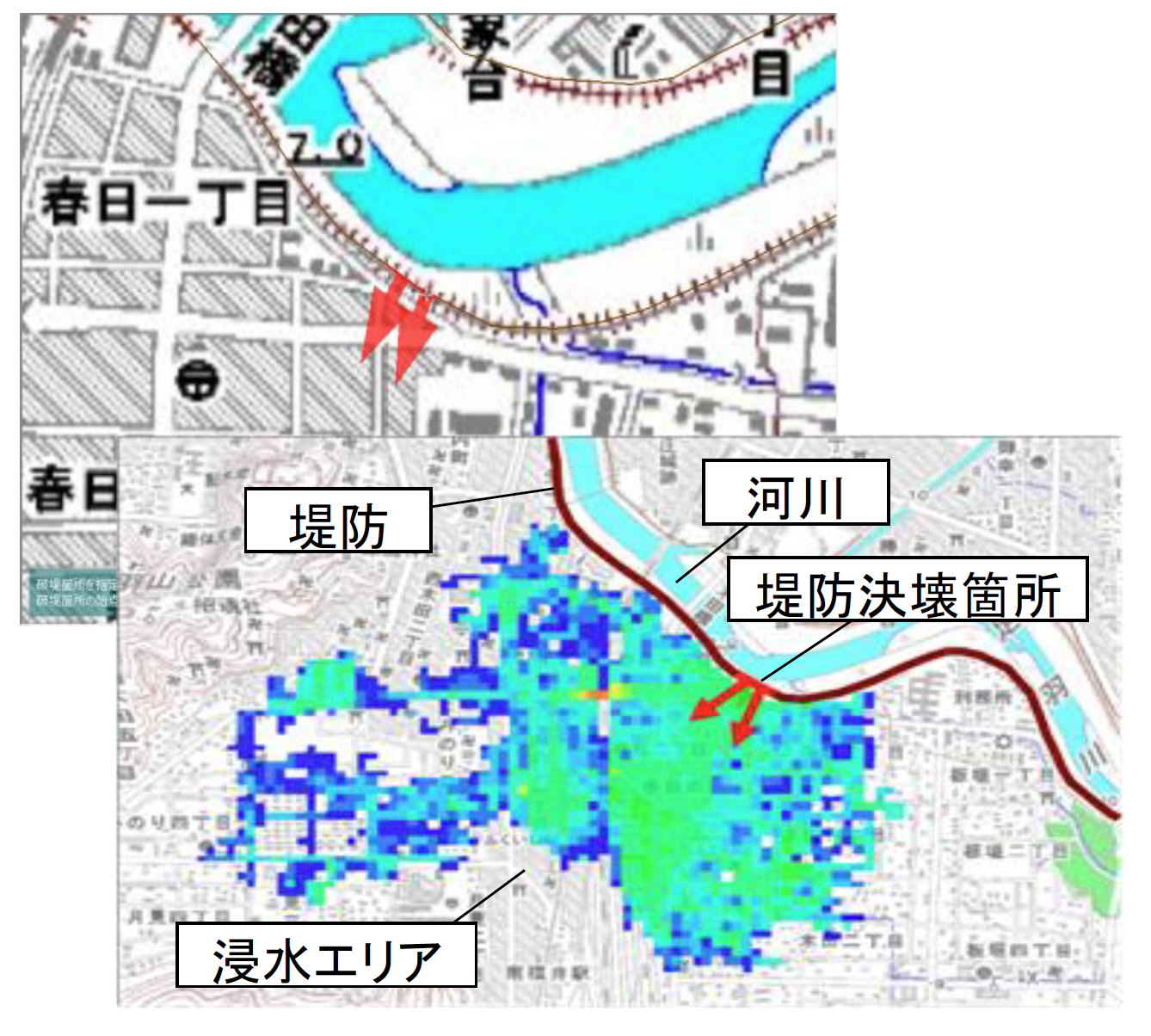 堤防に設定した決壊地点に流出量を設定しシミュレーションを行います。決壊地点や流出量を変えることで、浸水のリスクを把握することができます。2次元不定流計算によって、高速計算が可能です。