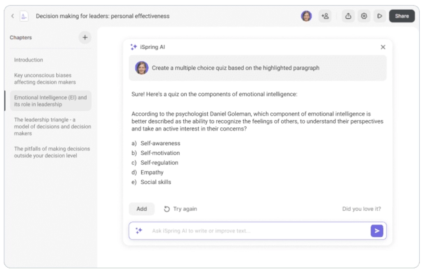 ライティング、編集、フォーマット作成など、手を借りたいときにいつでもコース作成を手伝ってくれる。まるで本物のアシスタントがいるかのように、e ラーニングプロジェクトの作業を進めることができます。
