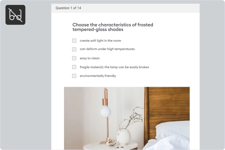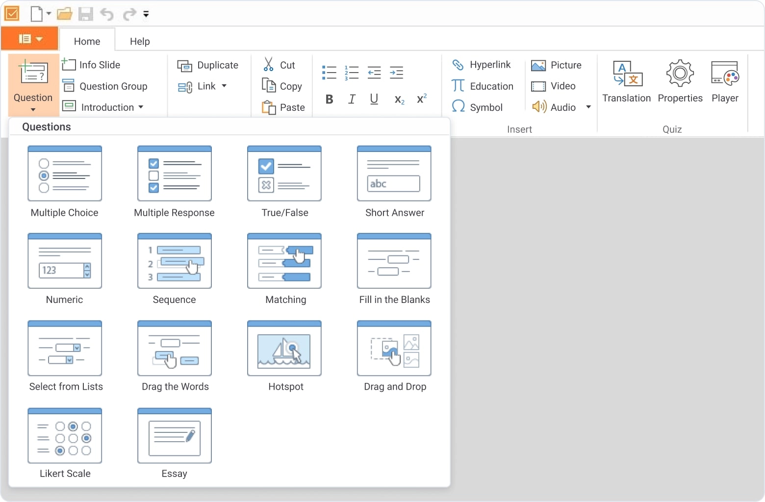 シンプルな多肢選択問題やマッチング問題から、穴埋め、並べ替え、ドラッグ & ドロップ、ホットスポットなどの高度な問題形式まで、多彩な問題種類で正確な知識確認を行います。