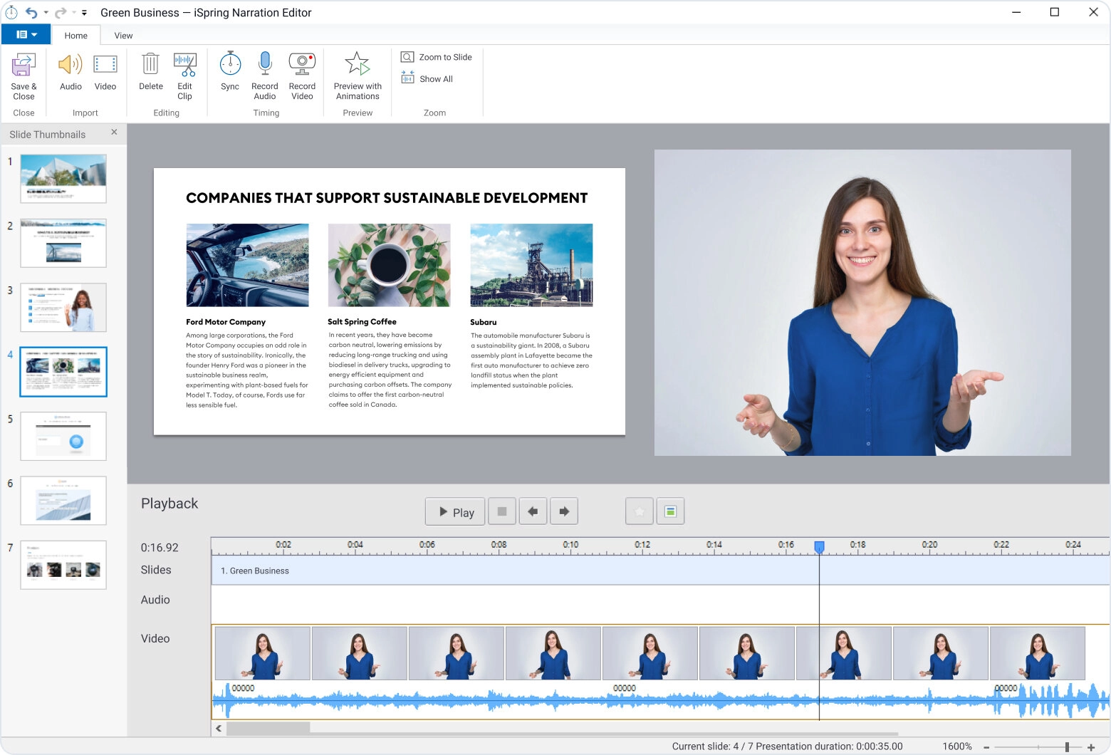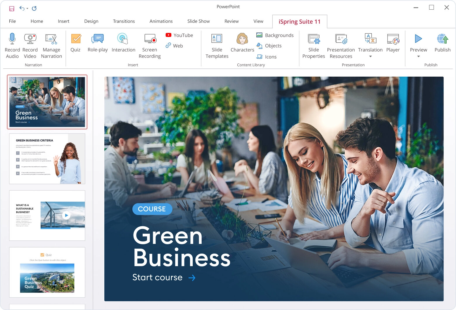 iSpring Suiteを使用することで、e ラーニングの開発経験がなくても、コースの作成、ナレーションの録音、クイズの作成、オンライン対応のコースの生成を簡単に行うことができます。