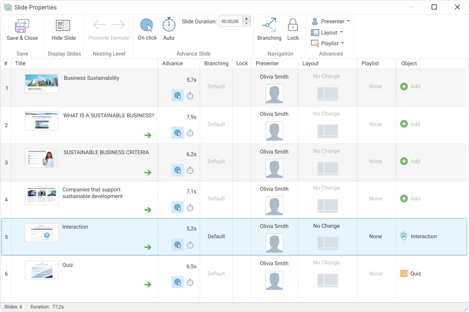 スライドごとにプレゼンターを指定したり、ナビゲーションを制限したり、分岐を設定したりできます。例えば、受講者が前のスライドに戻れないようにしたり、受講者のアクションに応じてコース内のナビゲーションが変わるような設定も可能です。また、発表者の情報、会社のロゴ、追加リソースへのリンクをプレゼンテーションに追加できます。説明書、記事、ビデオなど、コースのトピックに関するファイルを添付することもできます。