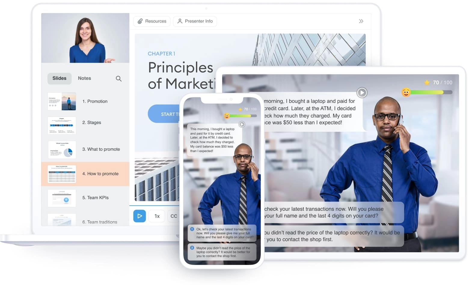 iSpringで一度変換すると、プレゼンテーションはあらゆるデバイスの画面サイズと向きに自動的に適応します。(対応プラットフォーム:Windows PC、Mac OS、iPad・iPhone、Android