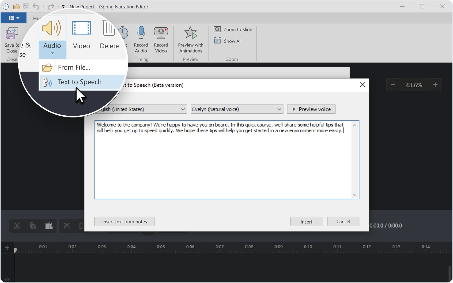 iSpring Suiteには、リアルな音声のAIナレーションを作成し、コンテンツを素早く簡単にローカライズするための強力な機能を備えています。8か国語に対応(英語、日本語、フランス語、ドイツ語、ロシア語、イタリア語、スペイン語、ポルトガル語)し、完全にローカライズされたインターフェースにより、外見ではなく学習コースそのものに集中することができます。また、声優に依頼することなく、プロフェッショナルなナレーションを作成できる上、翻訳されたナレーションを音声合成ウィンドウに追加し、利用可能な52の言語のいずれかを選択することで、簡単に各国向けにコースをローカライズすることができます。