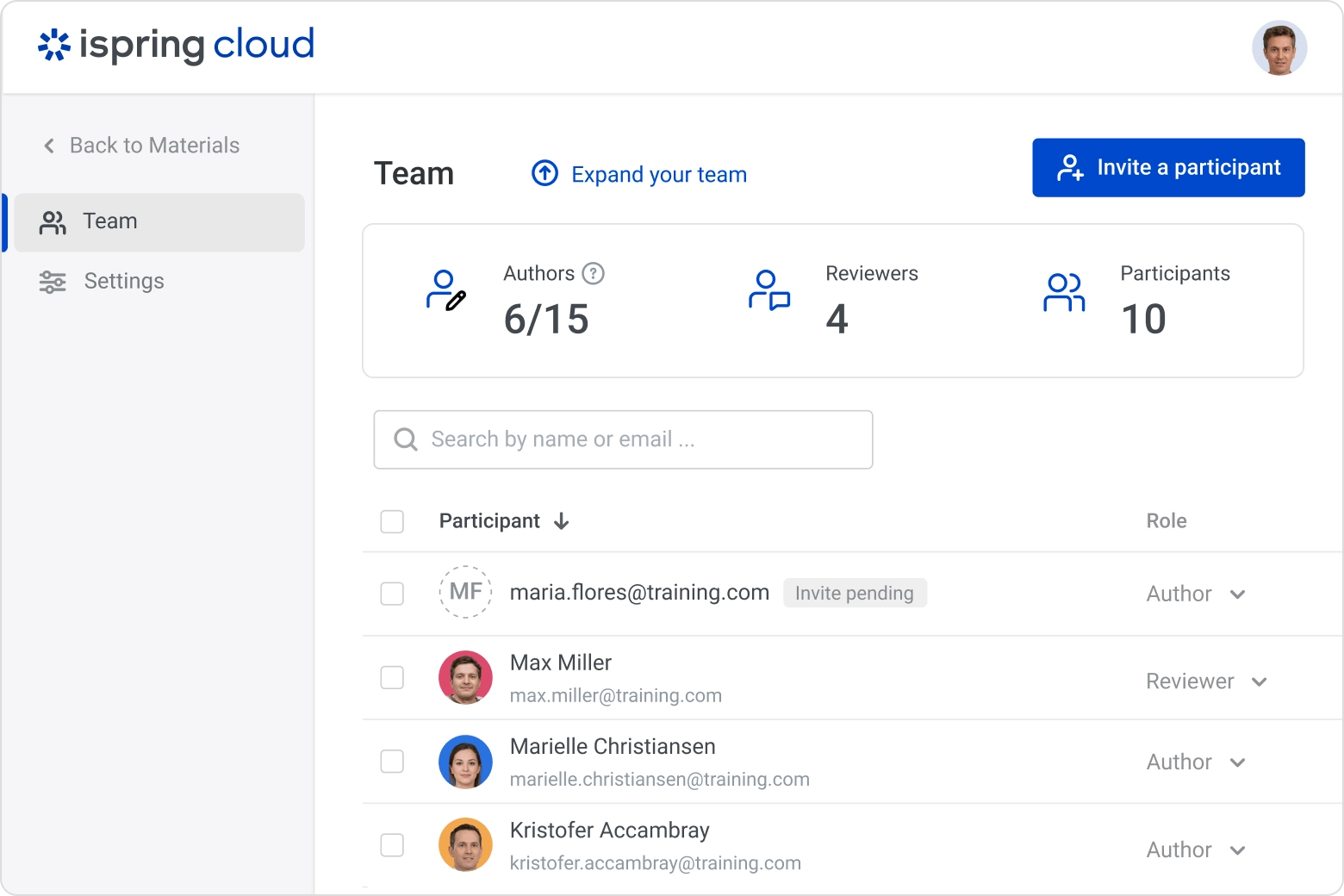 1 人でコースを作成する必要はありません。iSpring Cloud AI にプロジェクトをアップロードし、チーム メンバーにリンクを送るだけで、複数のチームメンバーと協力し、コースを短時間で作成することができます。