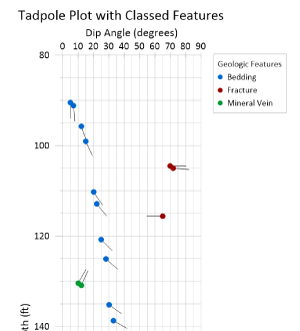 オタマジャクシ図を用いて、地層、断裂、鉱脈といった平面的な地質学的特徴の方向を視覚化します。円形のマーカーは傾斜角を表し、尾部は傾斜方位角を示します。特徴クラスは色分けされており、深度に沿った構造パターンを容易に解釈できます。