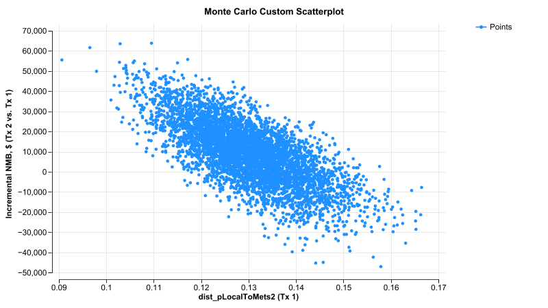 モデルシミュレーション(確率的感度分析および患者シミュレーション)から任意の2つの入力および/または出力に対して2次元散乱図を生成します。