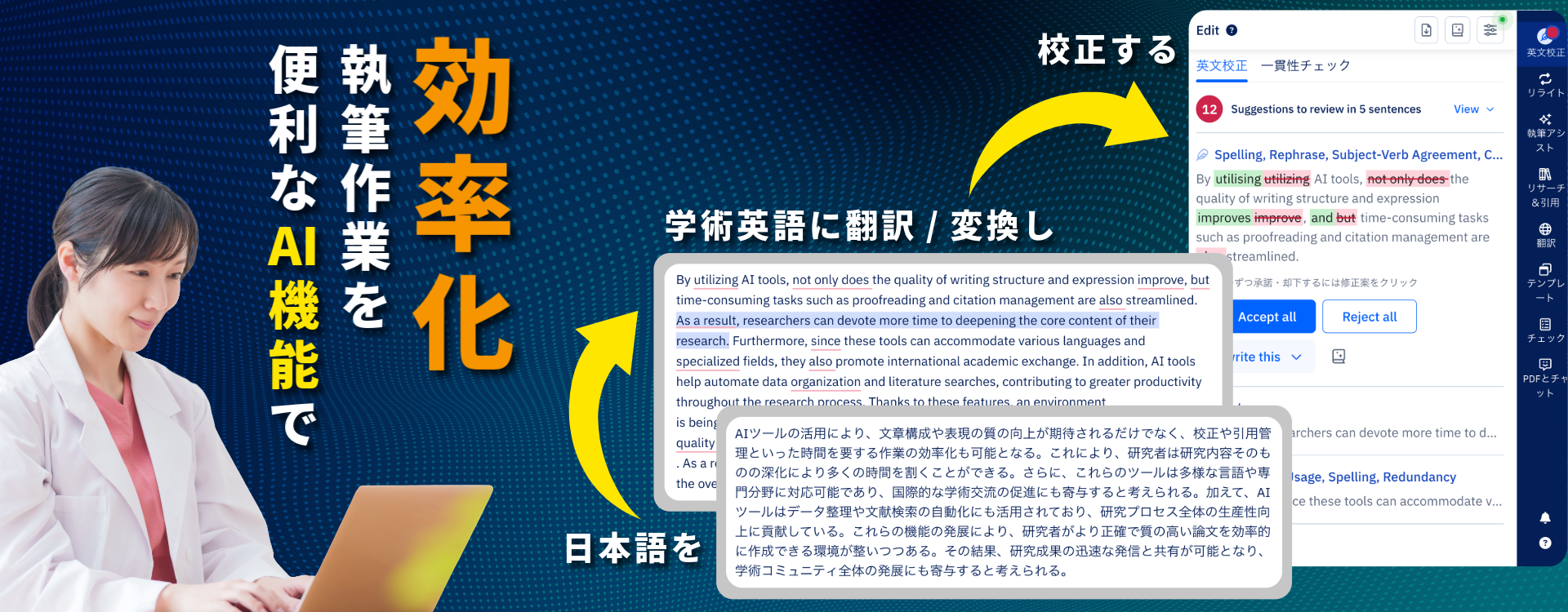専門家による校正に極めて近いアウトプットで、文法やスタイルの改善は勿論、生成AIを活用したリライトや文章提案まで、執筆作業を強力にアシストします。学術ジャーナル基準に準拠したリアルタイム提案で、効率的に洗練された論文執筆を実現します。