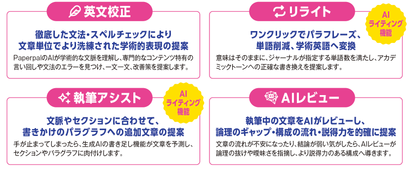 Paperpalは翻訳、英文校正、リライトなどのAI機能により、研究者が英語論文執筆で感じる言語のハードルを下げます。英語表現にかかる負担を軽減することで、研究内容そのものに集中し、研究成果をより円滑に国際発信できる環境を支援します。