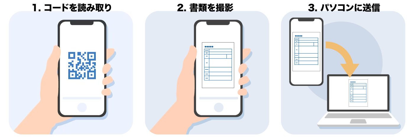 「さよなら手書き」が表示するコードをスマホで読み取り、専用ページを開いたら、「写真を撮る」を選択して書類を撮影(すでに撮影済みの書類も選べます)。「送る」をタップするとアプリに送信され、すぐ作業できます。