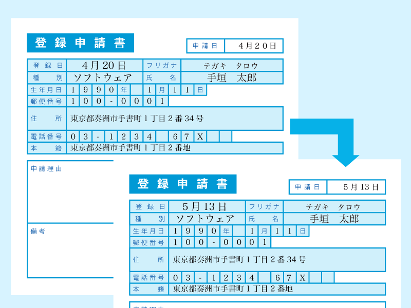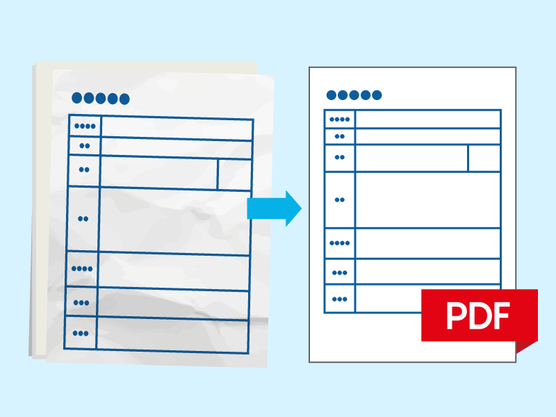 役所や官公庁への申請書類、確定申告など、定型の書式をきれいに書きたいとき、スキャンした紙書類の画像やPDFに、自動でテキストボックスを作成し、直接文字を入力できます。所定用紙には入力した文字だけを記入欄に合わせてピッタリ印刷でき、提出書類を美しくラクに作れます。