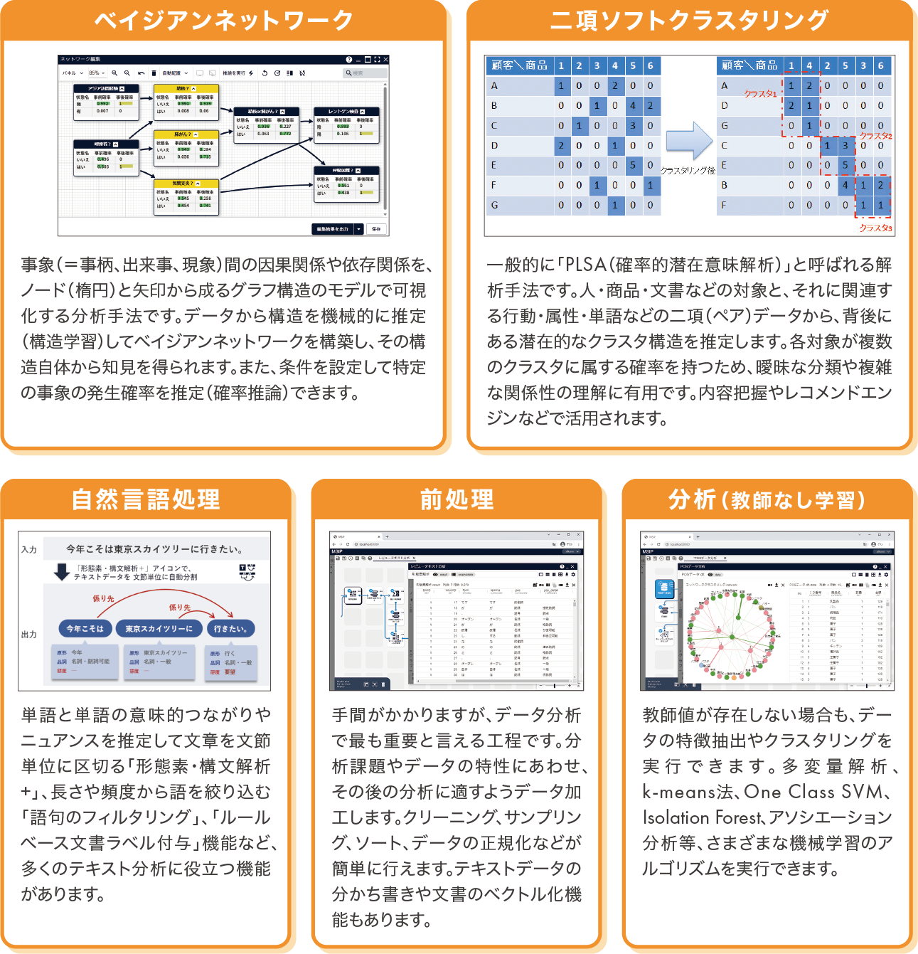 教師値が存在しないケースでも、データの特徴抽出やクラスタリングを実行できます。多変量解析、k-means 法、One Class SVM、Isolation Forest、アソシエーション分析、ネットワーククラスタリング、二項ソフトクラスタリングなどさまざまな機械学習のアルゴリズムを実行できます。